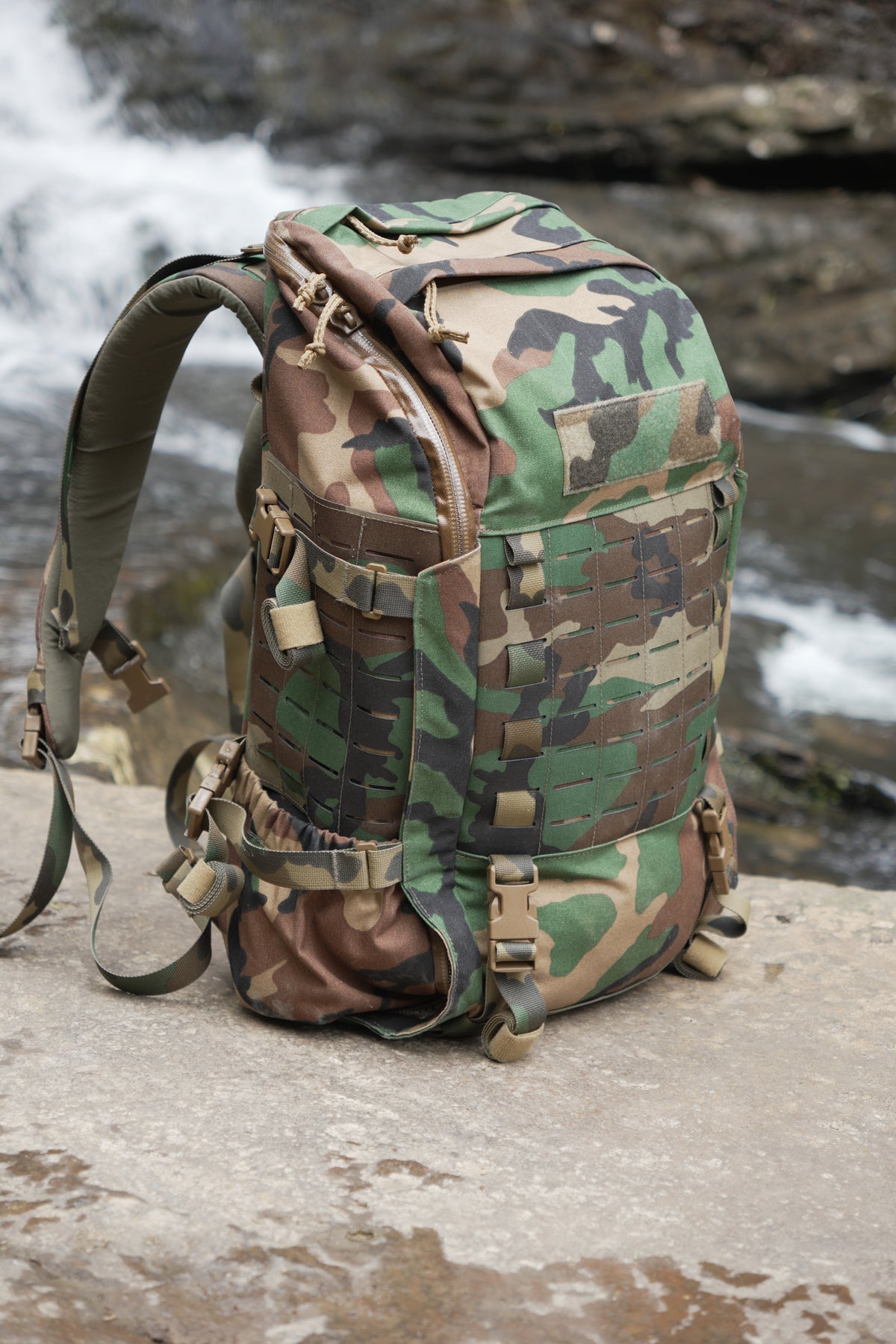• Laminated laser-cut MOLLE on front, sides, and interior of pack