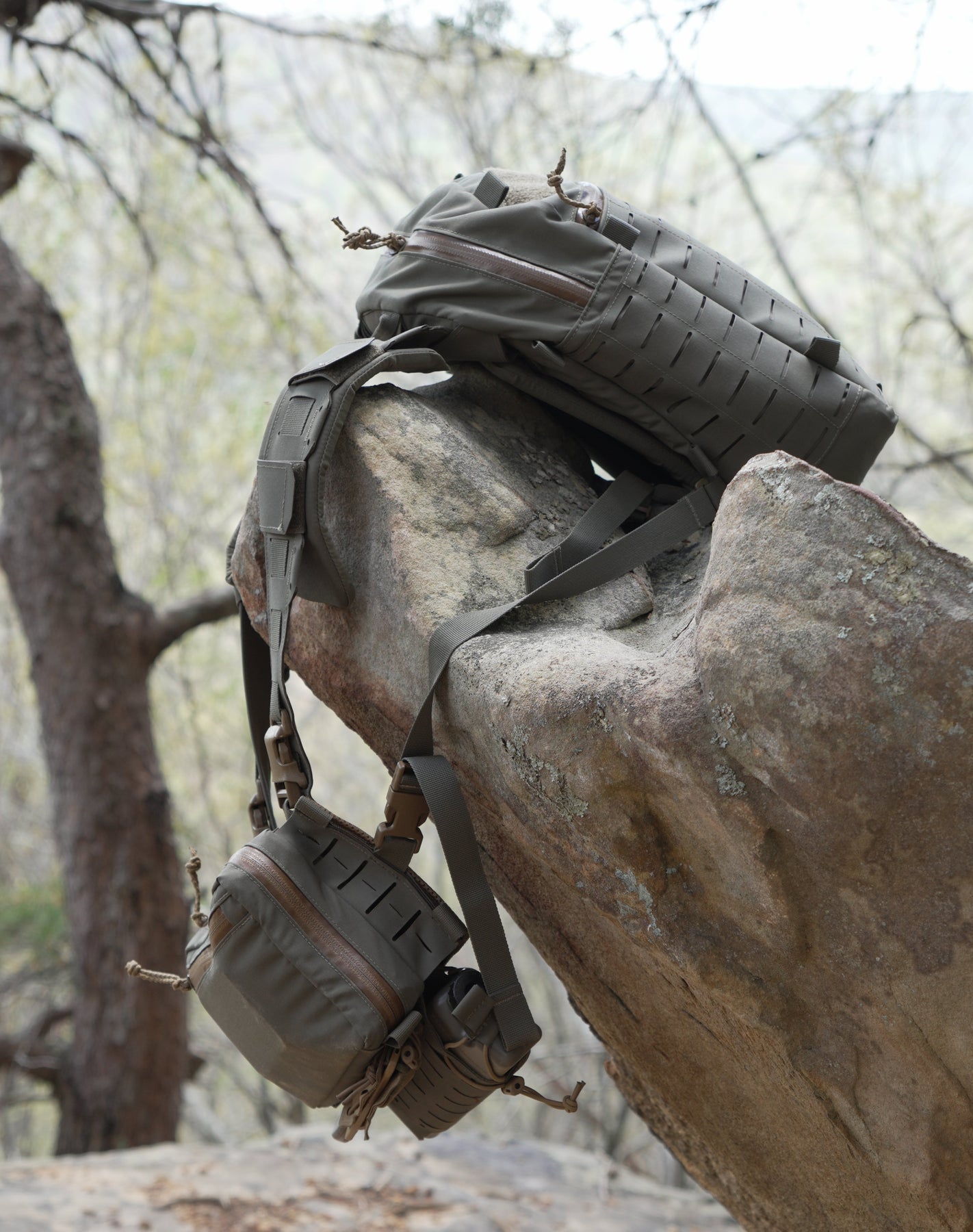 It has laser-cut MOLLE on the back panel for attaching to plate carriers or adding our back pads if using the pack without armor. It integrates perfectly with our chest rig-kit bag shoulder harness so it can be worn as a complete one-piece rig or used as a standalone EDC/day pack.