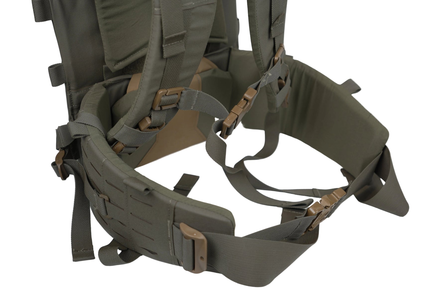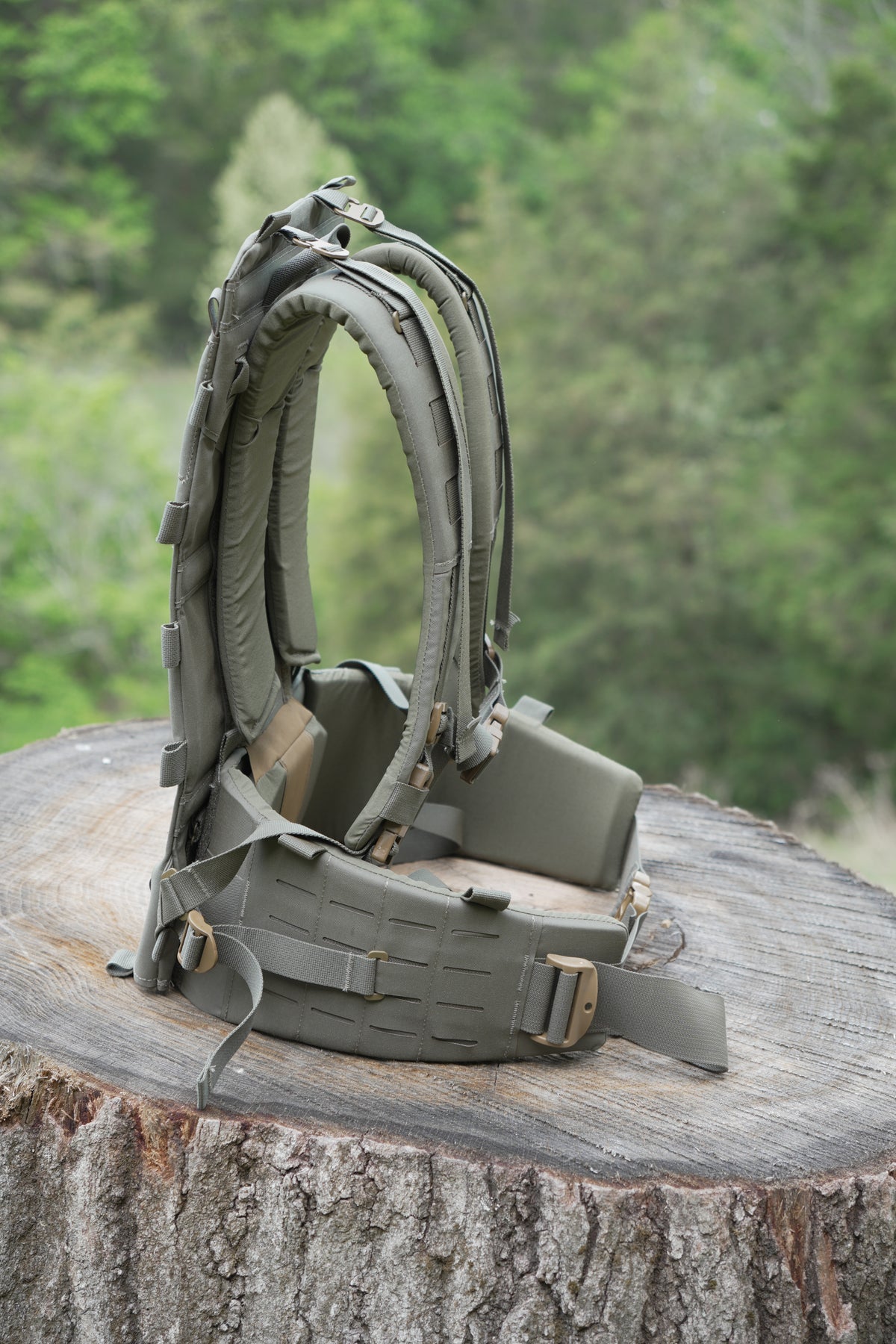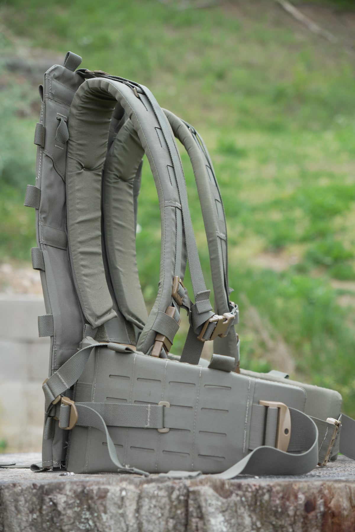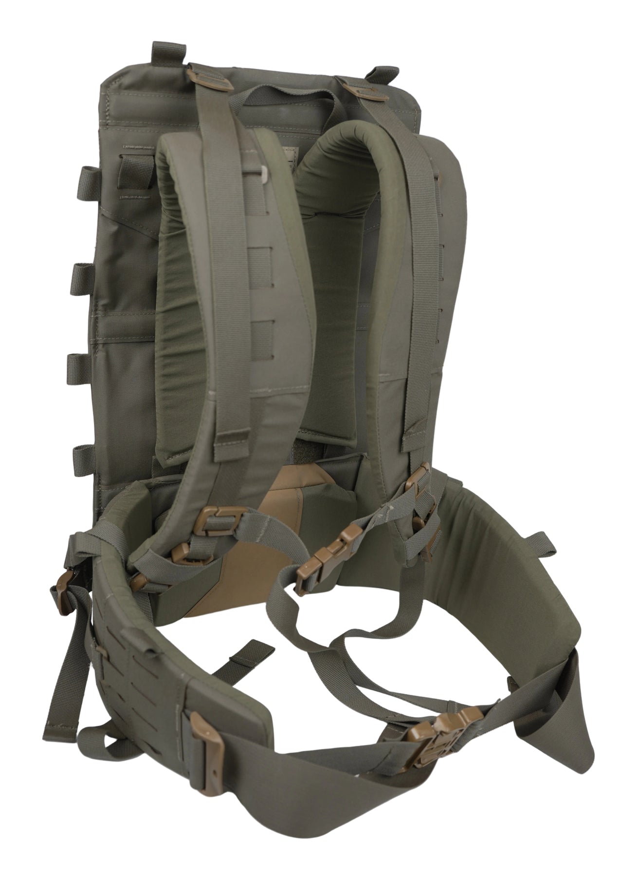 With a new revolutionary, proprietary adjustable yoke system and removable/adjustable thick-padded lumbar/hip belt, comfort is top-notch and can be dialed in for different torso lengths. The hip belt and shoulder harness can also be removed and used as a complete load-bearing belt kit that also attaches to our chest rigs.