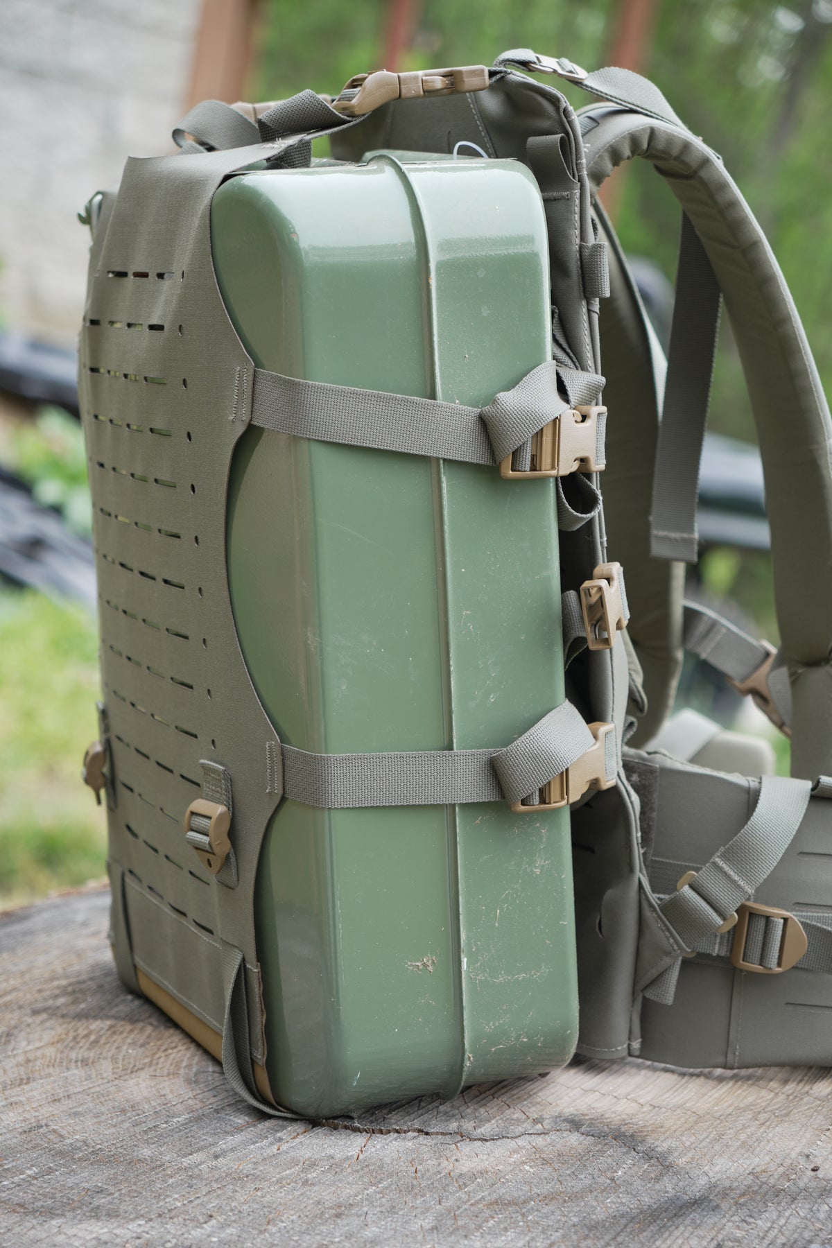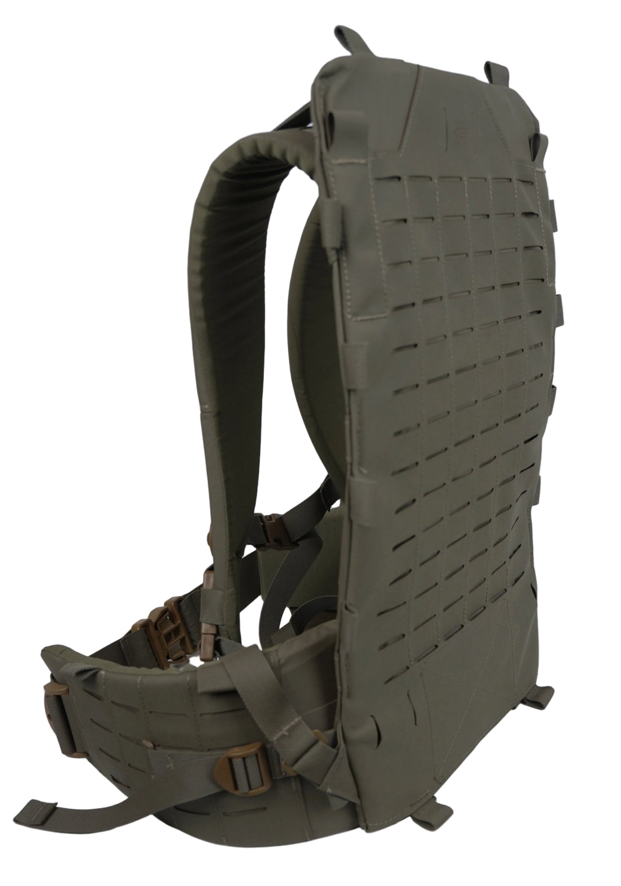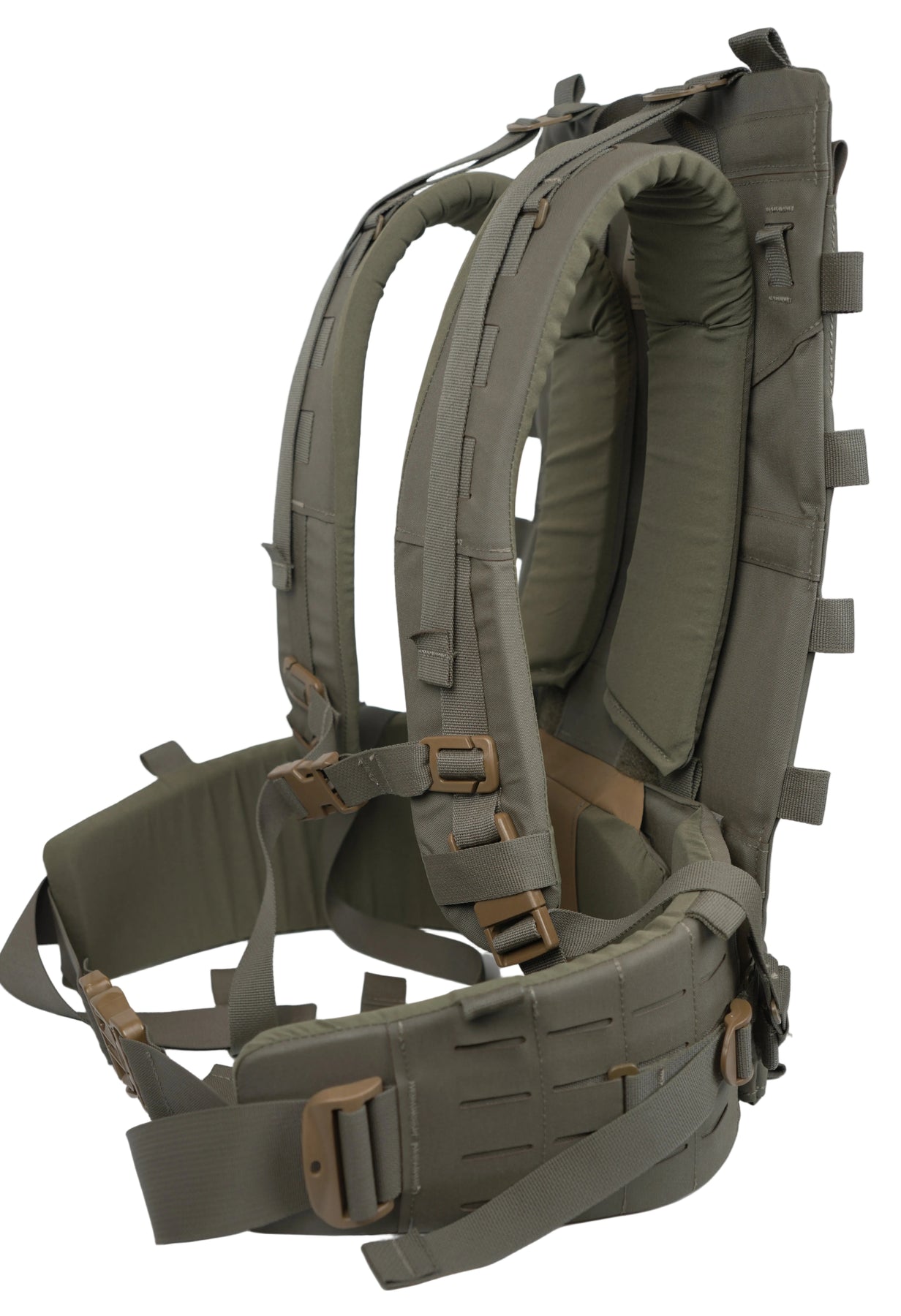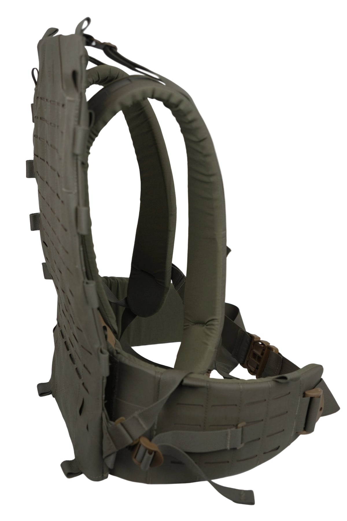 Covered with a slick laser-cut PALS/MOLLE packboard on the front and the ability to attach a load sling/beavertail, this frame is as modular as it can get - allowing the user to carry equipment between the pack bag and frame, or use the frame independently for strapping down awkward loads.